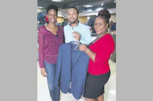 Sandre Lowers, purchasing officer, Wisynco,nabs a classic blue suit from Lee’s Fifth AvenueSovereign Centre on Thursday. Sharing in his joyfor savings are partner Zoann Lyn (left), psychologymajor, University of the West Indies, Mona, andsales representative Anika Tyrell.
