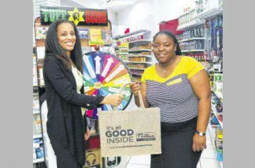 FontanaPharmacy marketing manager ColetteMorrison Chen (left) presents Embassy ofthe Republic of Korea to Jamaica researcherKerriann Williams with her spin-the-wheel prizeof a Fontana straw bag.