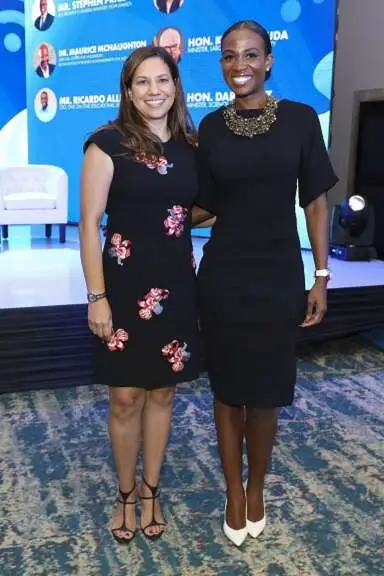 Partners in the Jump programme pause for a photo op during the launch at the Jamaica Pegasus hotel. (From left) Floyd Green, Minister Without Portfolio in the Office of the Prime Minister; Noelle Smikle, Director, Cable & Wireless Charitable Foundation; Karl Samuda, Minister of Labour and Social Security; Stephen Price, VP & General Manager, Flow and Chairman, Flow Foundation; Daryl Vaz, Minister of Science, Energy and Technology; Dr Maurice McNaughton, Director, Centre for Innovation â Mona School of Business & Management and Ricardo Allen, CEO, One on One Educational Services.