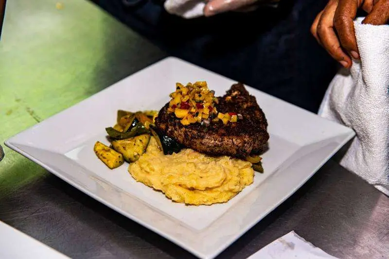 The main course featured a Blue Mountain Coffee Rubbed Filet Mignon with a Tamarind Demi-Glace served on young chef Megan Mitchell’s Aligot (French Mashed Potatoes). This was a highly requested item made from local grass-fed beef, compliments of Nations Choice Ltd. The Pan Seared Copperwood Pork Chop topped with a Jackfruit Salsa served with a Sweet Potato Pavé and Roasted Vegetables got rave reviews from the guests.