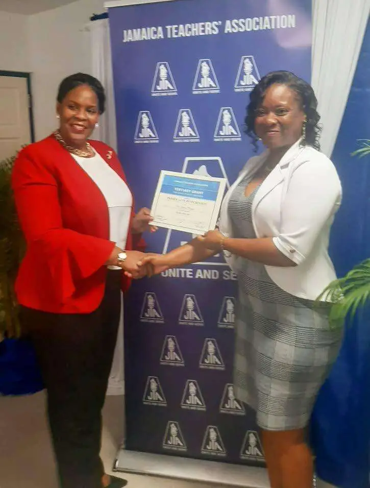 Speaking on behalf of recipients, Terry-Ann Hutchinson — who has about 17 years of teaching under her belt and is now pursuing a master’s degree in education psychology — pointed to the grant as one of the many benefits of membership in the JTA., and ncouraged new teachers to join. Her call comes within the context of turbulence within the group as some disgruntled teachers who wished to cease being members complained that the association was making it difficult for them to leave.