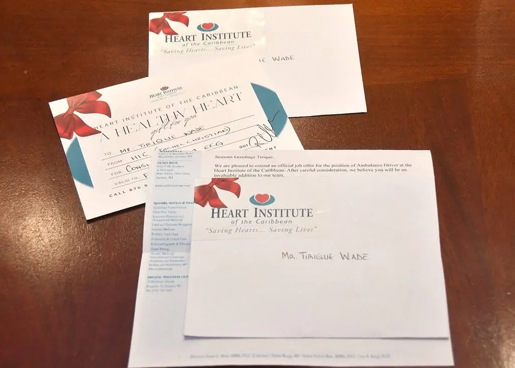 Tirique Wade was on Thursday offered a job as an ambulance driver trainee by Heart Institute of the Caribbean (HIC). He was presented with the offer along with several vouchers and other goodies by HIC’s Head of Community Engagement and Market Development Rachel Christian at the Jamaica Observer’s Beechwood Avenue headquarters in St Andrew.