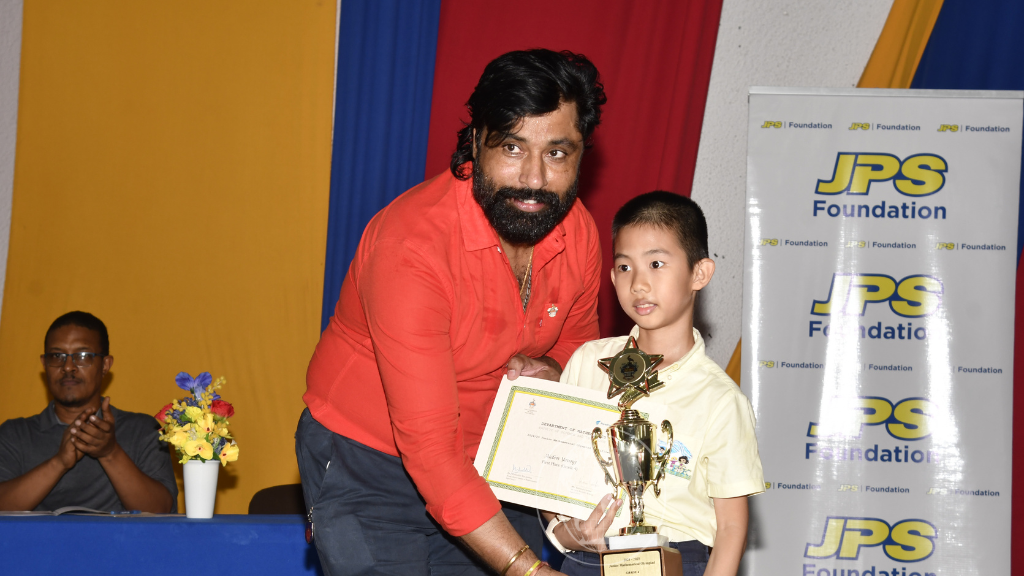 Dr Mahesha Narayana, head of the University of the West Indies, Mona department of Mathematics presents Aiden Yeung of Porter Centre for Knowledge with his first place award for the grade four category at the 2025 staging of the Jamaican Mathematical Olympiad. Photo: Karl McLarty