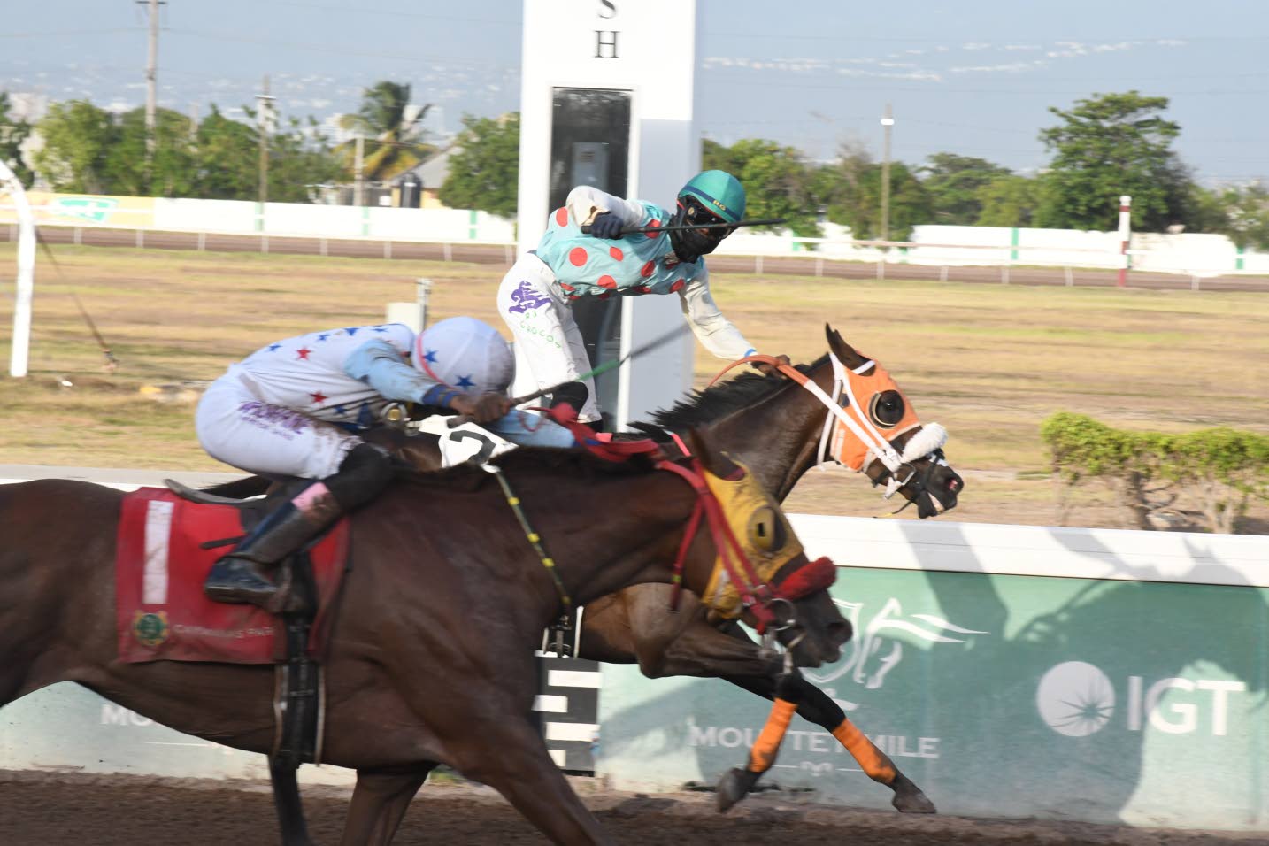 Matuso (right-Romario Spencer) just holds on from the fast-finishing Oil Machine (Raddesh Roman) on Saturday, July 12, 2025.Karl Mclarty