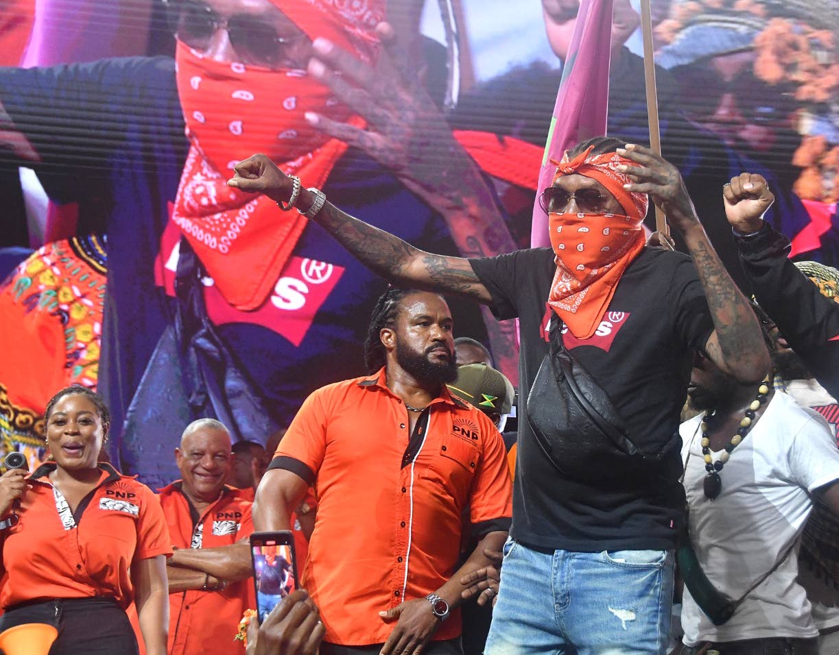 * September 15, 2024 — Kartel made a surprise cameo at the 86th annual conference of the People’s National Party (PNP) at the National Arena in Kingston alongside his attorney. The entertainer did not speak but made the PNP’s clenched fist symbol as Buchanan expressed that the party was fighting for “the future, the freedom, justice and the constitution” of Jamaica.