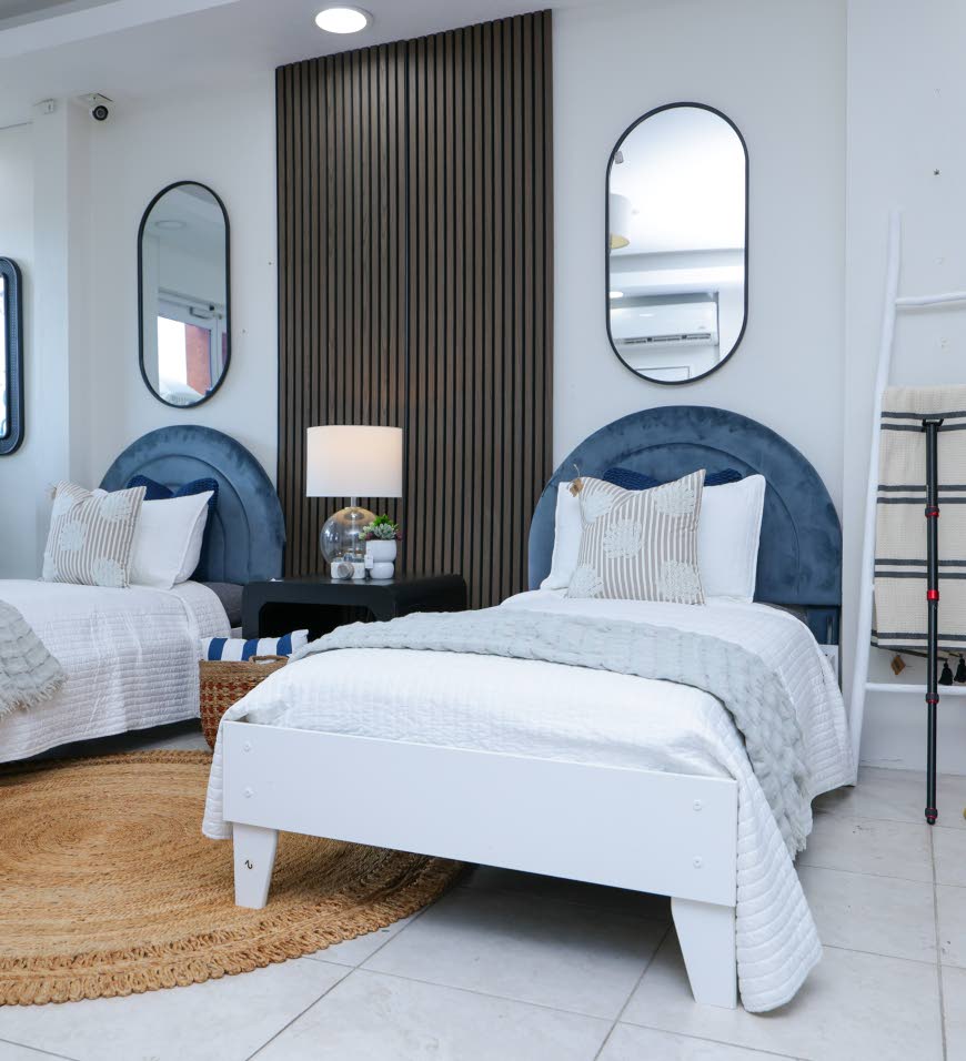 A soothing palette of crisp white, soft blue, and natural textures set the tone in this twin-bedroom scene — one of the many thoughtfully styled zones unveiled at the Sun-Kissed Spaces Summer Brunch. (Photo: Leo Hudson)