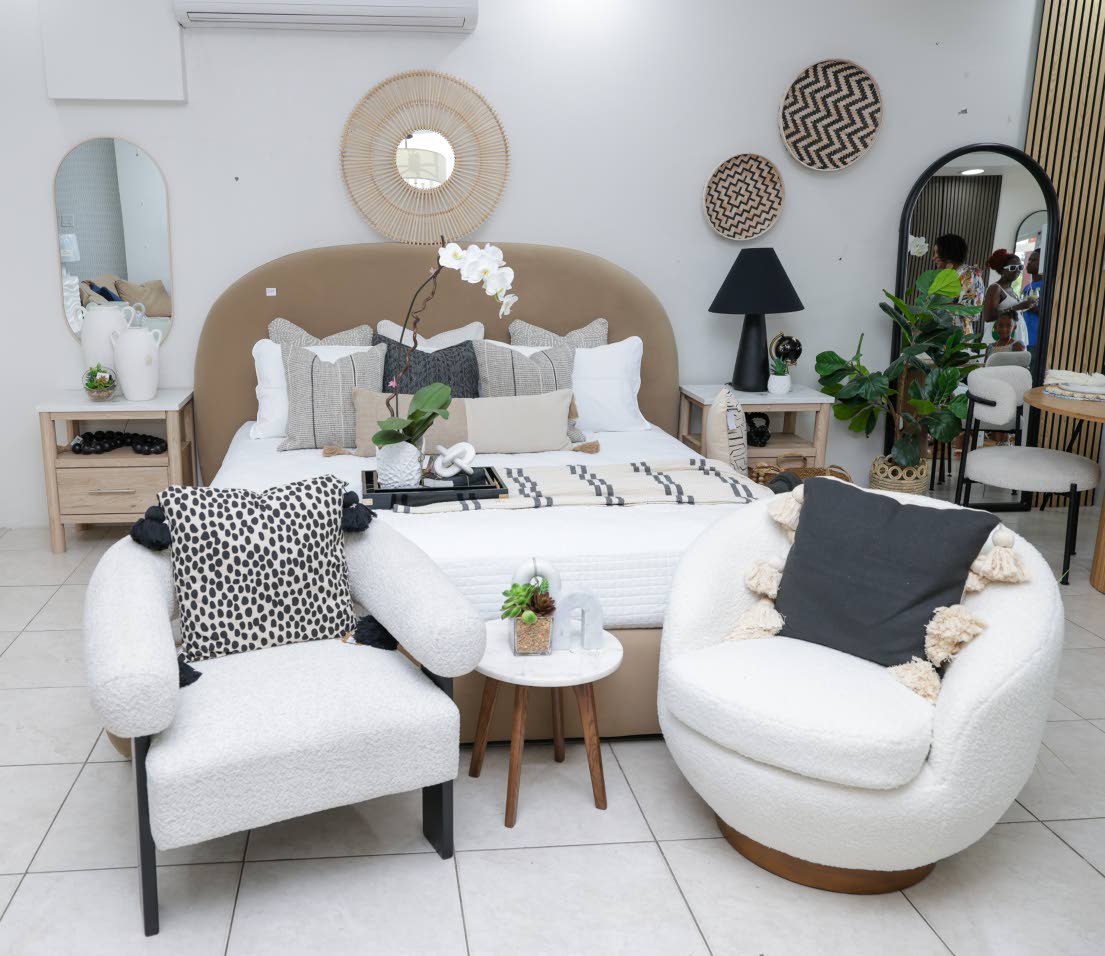 Neutral never looked so good! A perfectly layered bedroom moment featuring soft boucle accent chairs, a rich velvet-upholstered bed, sculptural décor, and globally inspired textures. A standout scene from the Sun-Kissed Spaces Summer Brunch. Each piece not only serves as a functional element but also as a statement of personal style, drawing the eye and sparking conversation. With carefully chosen colours and textures, your retreat becomes a sanctuary where relaxation meets sophistication. (Photo: Leo Hudson)