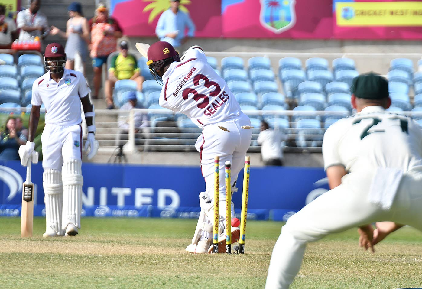 West Indies tail-ender Jayden Seales is bowled by Australia’s Mitchell Starc (out of picture) while his teammate Alzarri Joseph (left) looks on, on day three of the third and final Test match at Sabina Park in Kingston, Jamaica, on July 14, 2025. (Photo: Garfield Robinson)