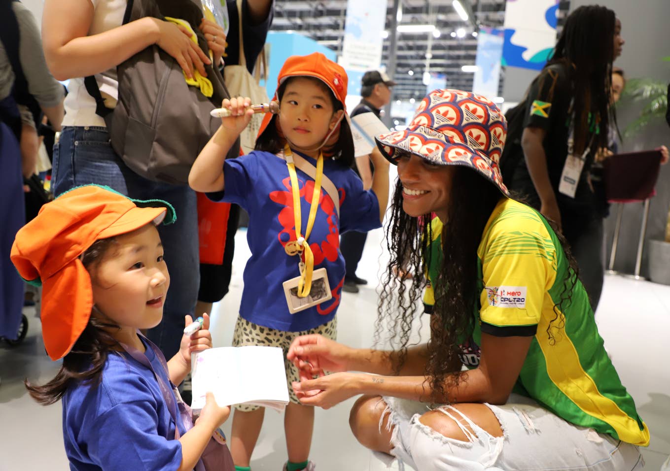 Recording artiste Naomi Cowan engages with two children who visited the Jamaica Pavilion at Expo 2025 Osaka, Kansai, Japan on Tuesday, August 5. (Photo: Shanna K Salmon)