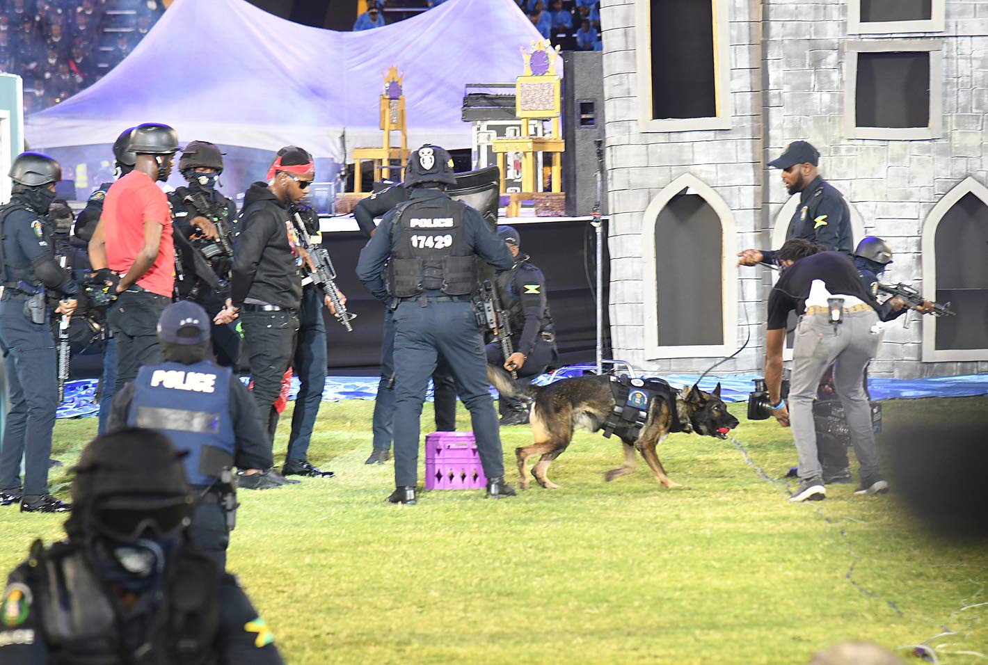 Those screams got louder as the Jamaica Constabulary Force (JCF) served up an exciting tactical display. Dubbed Operation Strike 63, the JCF gave patrons a glimpse into what is likely to unfold during special operations to apprehend criminals. Rifles in hand, sirens blaring, scores of police officers took to the stadium infield for the re-enactment. Tango, a specially trained dog from the JCF’s Canine Unit, was the star of the show as he uncovered a weapon stashed by the criminal during the showcase. The display ended with the JCF vowing to rid the country of criminal elements in its plight to keep Jamaica safe.