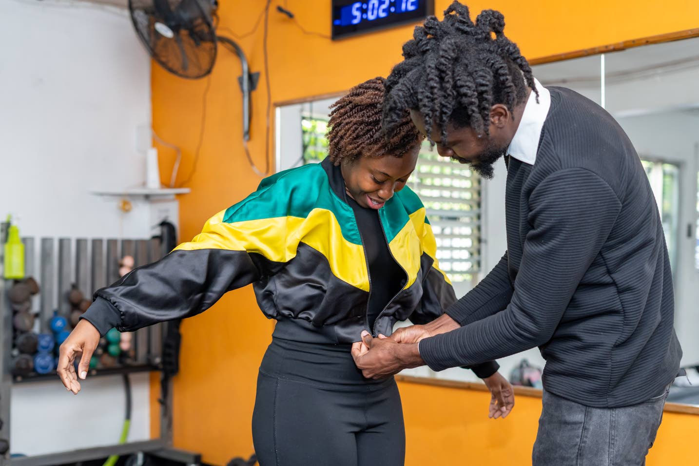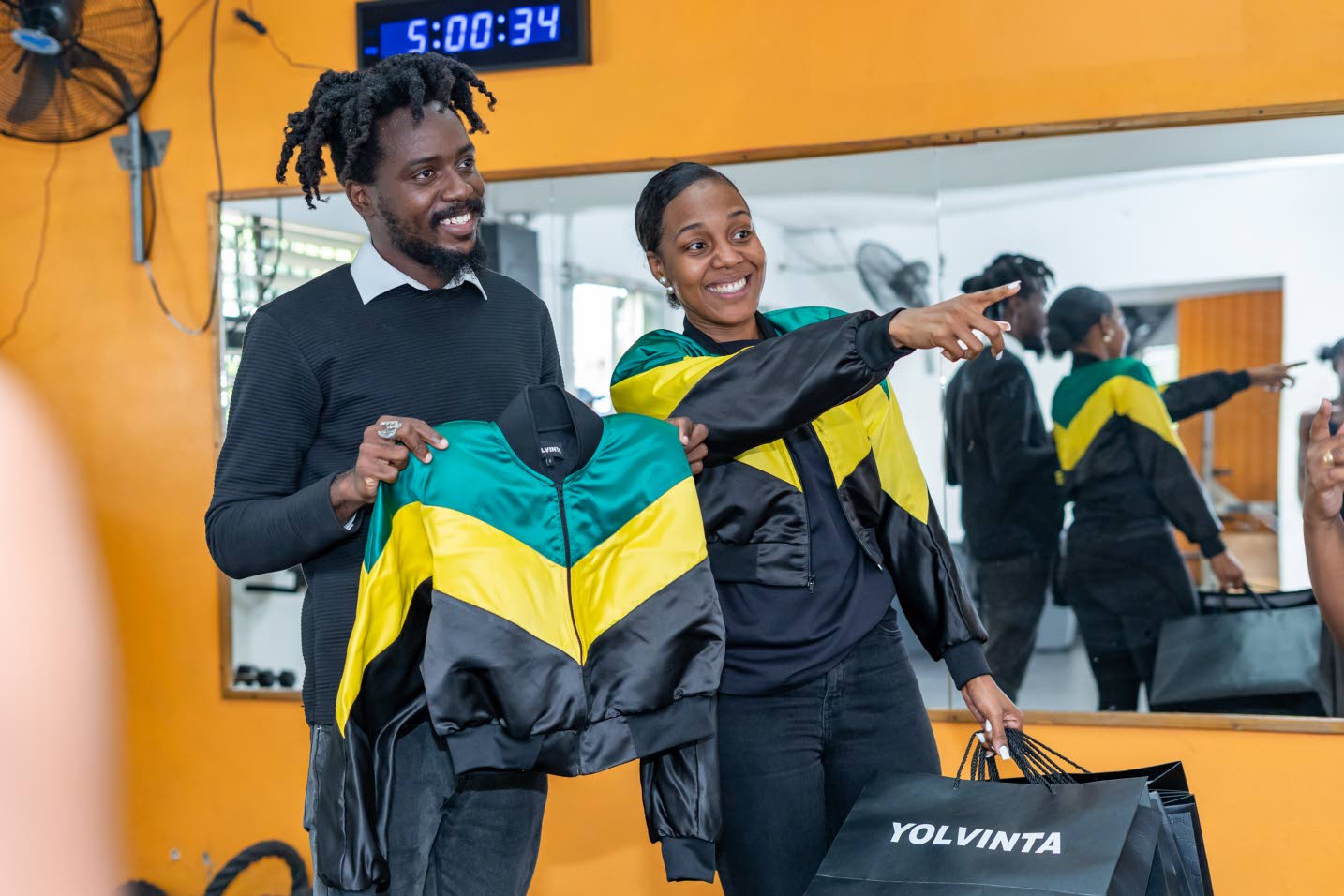 Yolvinta founder & Creative Director Romario Clarke is accompanied by Dr Terri-Karrelle Johnson as they surprise the PAH! Def Dance Community dancers with the brand’s Skippa Bomber Jacket. (Photo: Jermaine)
