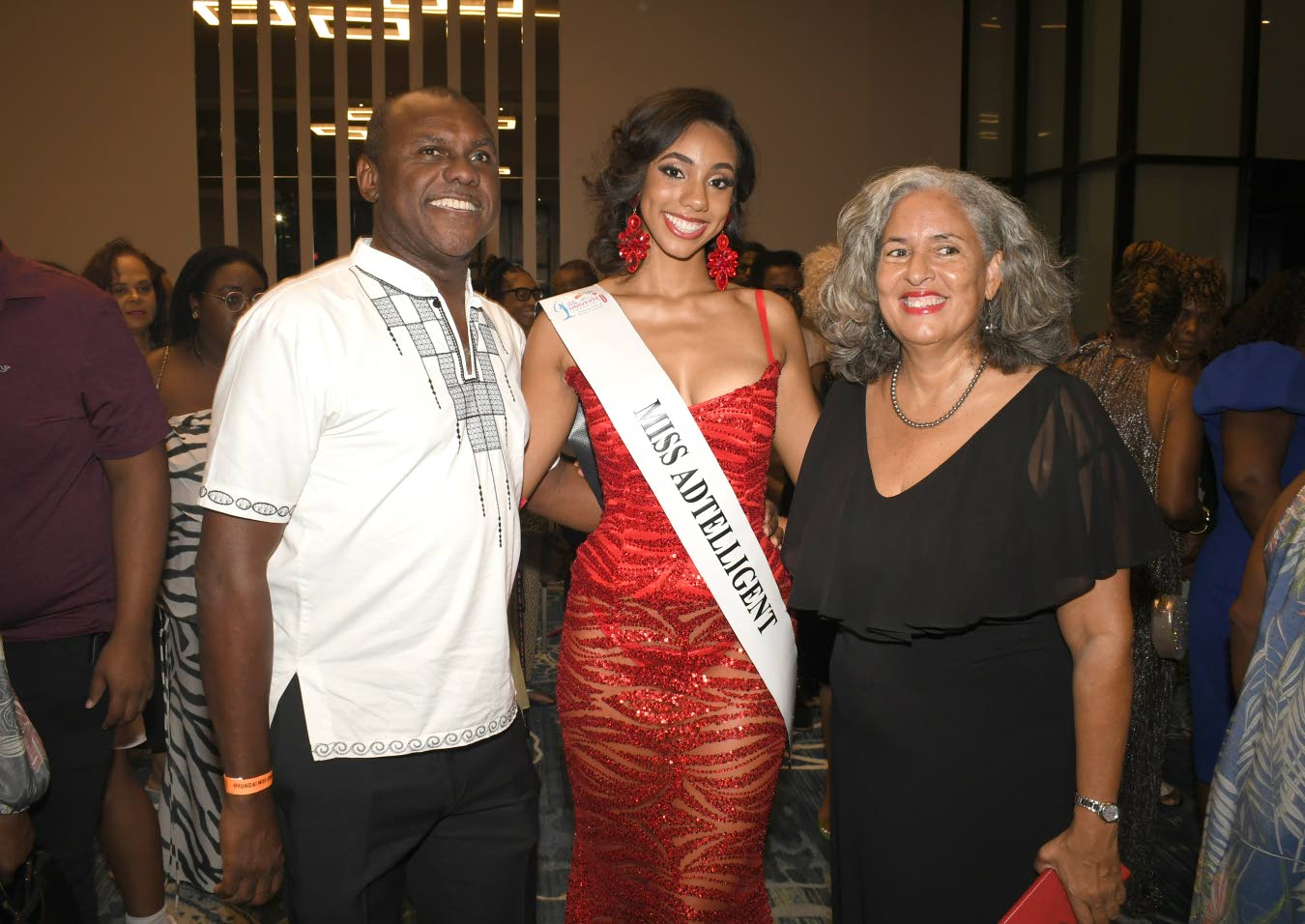 Miss Universe Jamaica 2025 top six finalist Naima Scott (centre) received congratulations from her mum, Jamaica Money Market Brokers Executive Director Donna Duncan-Scott, and dad, businessman Alwyn Scott.Karl Mclarty