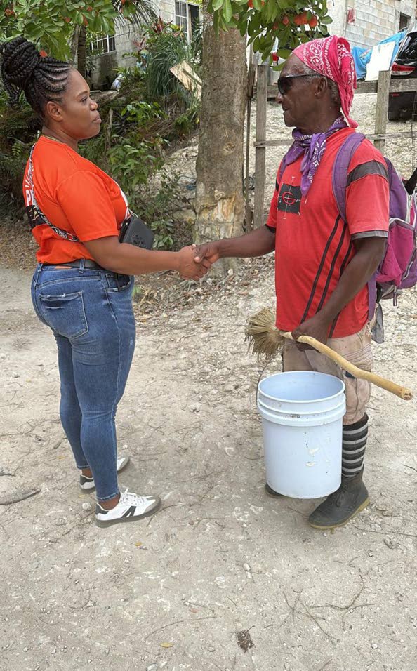 People’s National Party standard-bearer for St James East Central Rushell Reid-Knott greets a constituent during a walk-through.