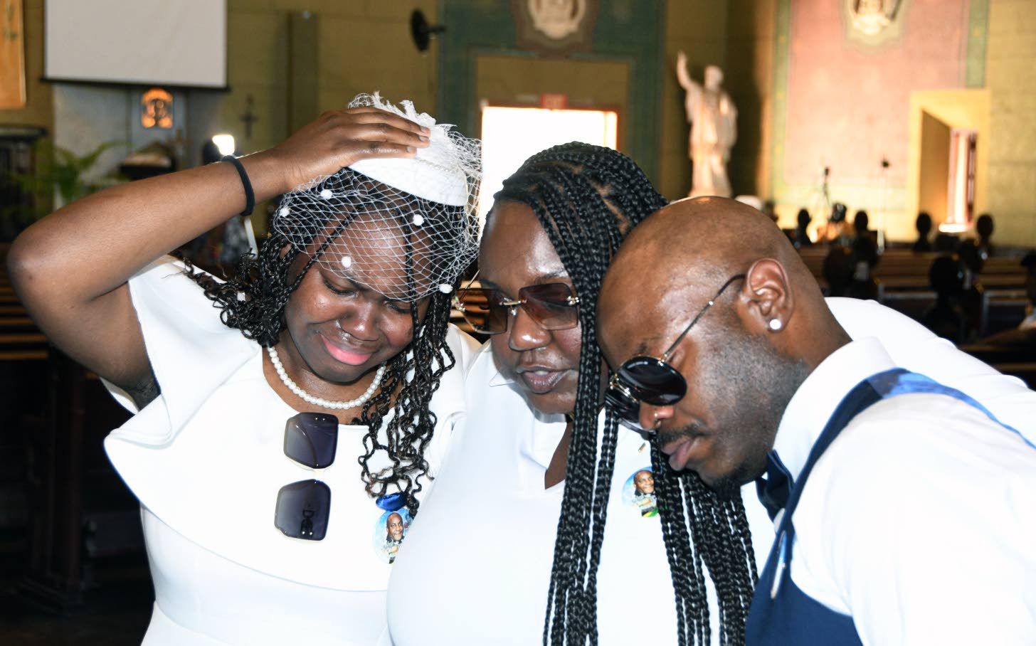Children of the late Michael McCallum (from left) Miya, Breana and Michael McCallum Jr support each other at the casket bearing the remains of their father, ahead of the thanksgiving service celebrating his life at Holy Trinity Cathedral in Kingston on Saturday. (Photo: Joseph Wellington)