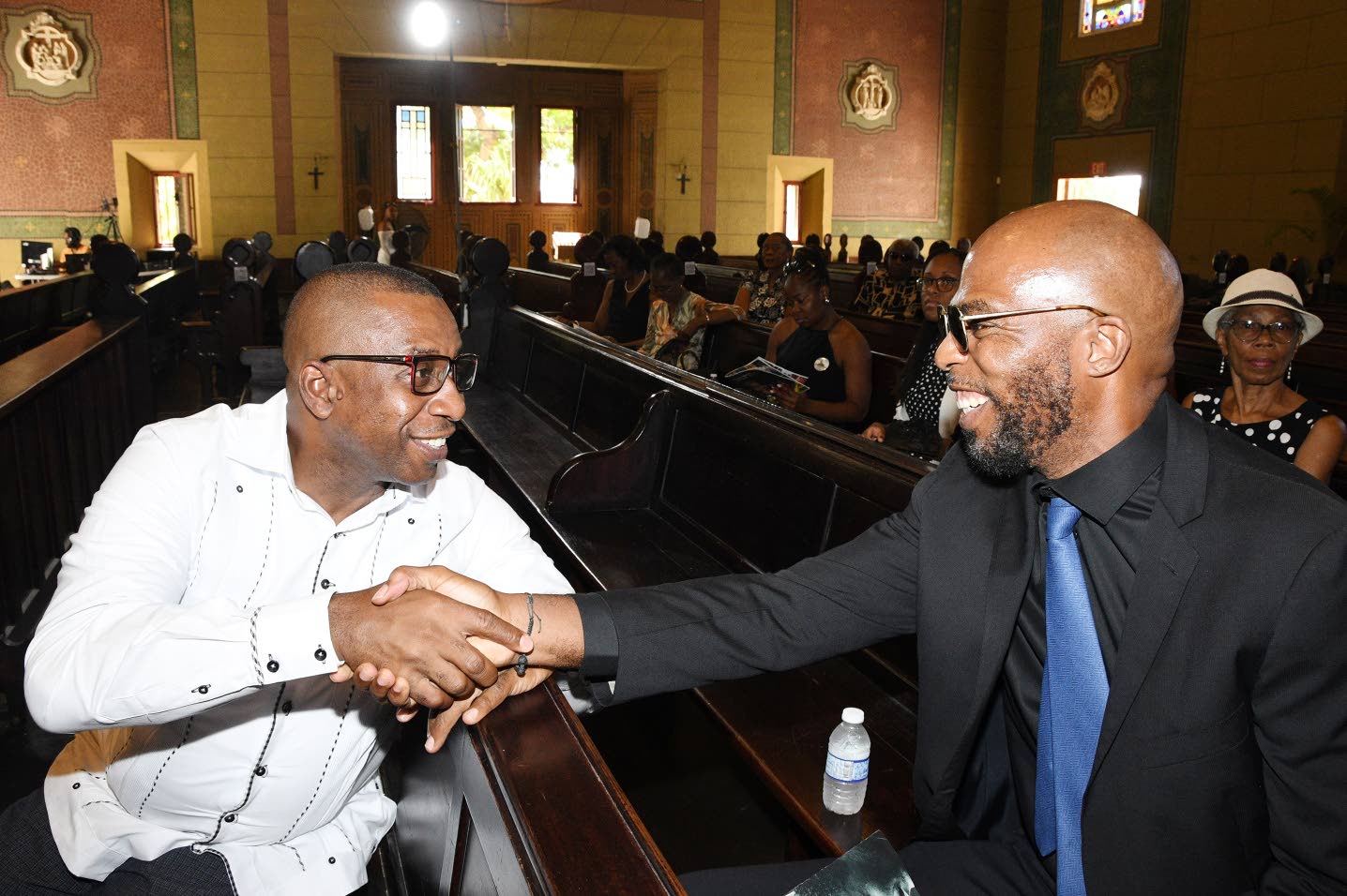 Mayor of Kingston Andrew Swaby (left) greets Stephen “Bomber” Jones, president of Jamaica Boxing Association, at the thanksgiving service for the life of Michael McCallum at Holy Trinity Cathedral in Kingston on Saturday. (Photo: Joseph Wellington)