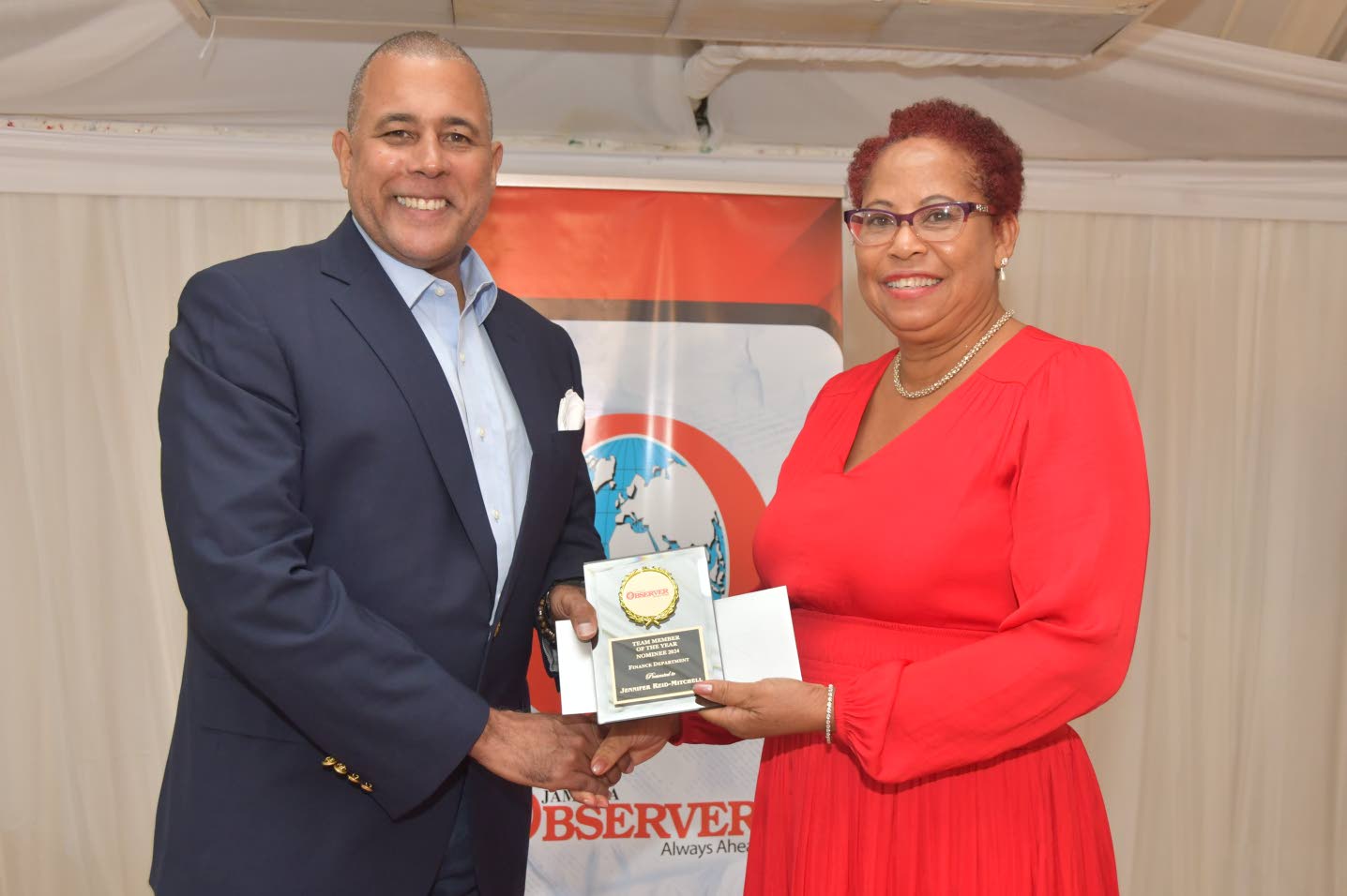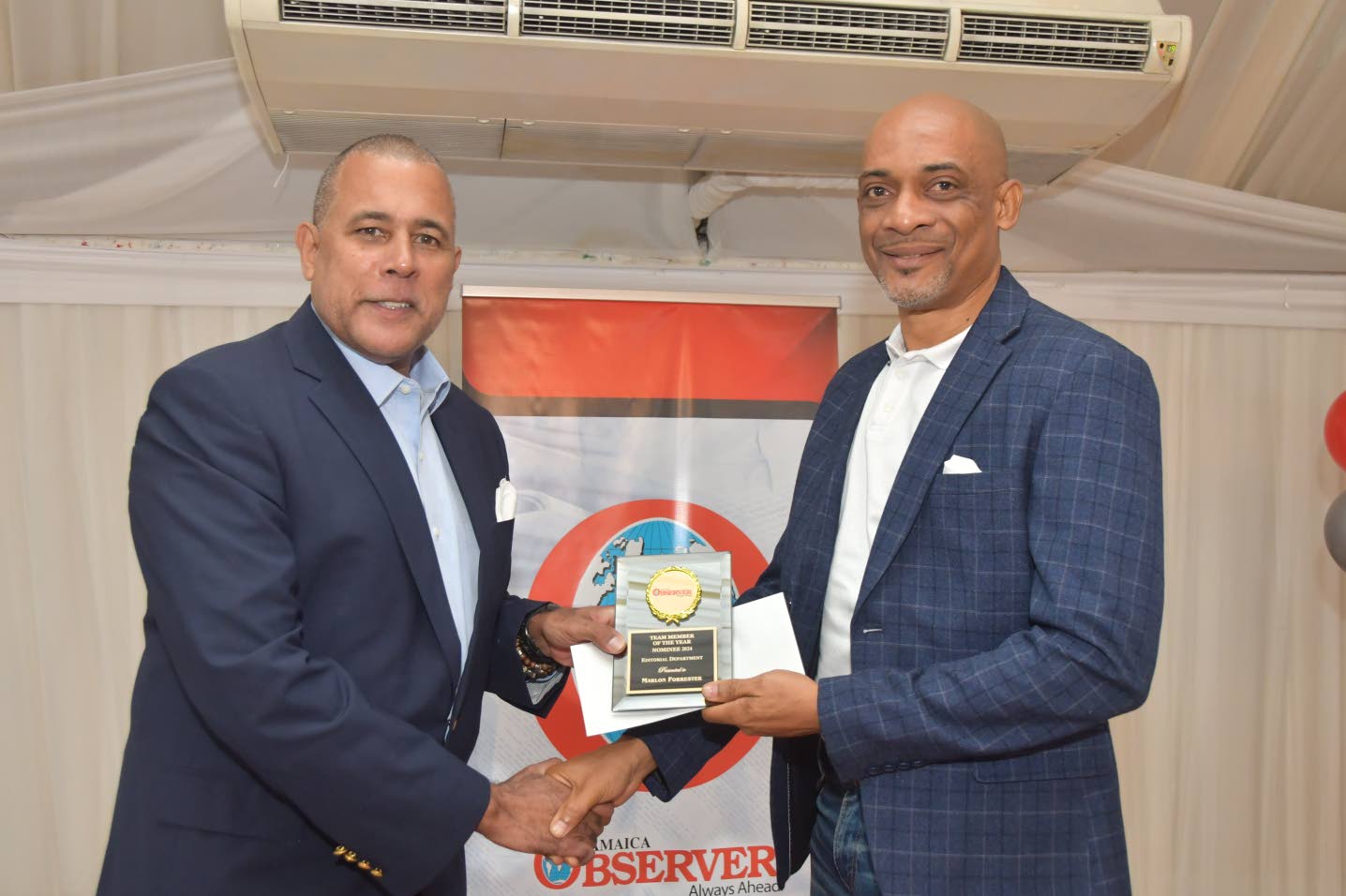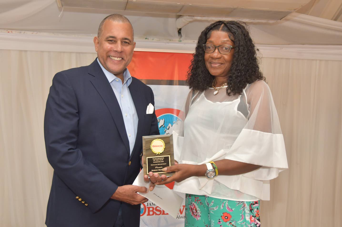 Vendor of the Year Dawnette McLean receives her award from Systems/IT Manager Obadiah Morgan. (Photo: Naphtali Junior)
