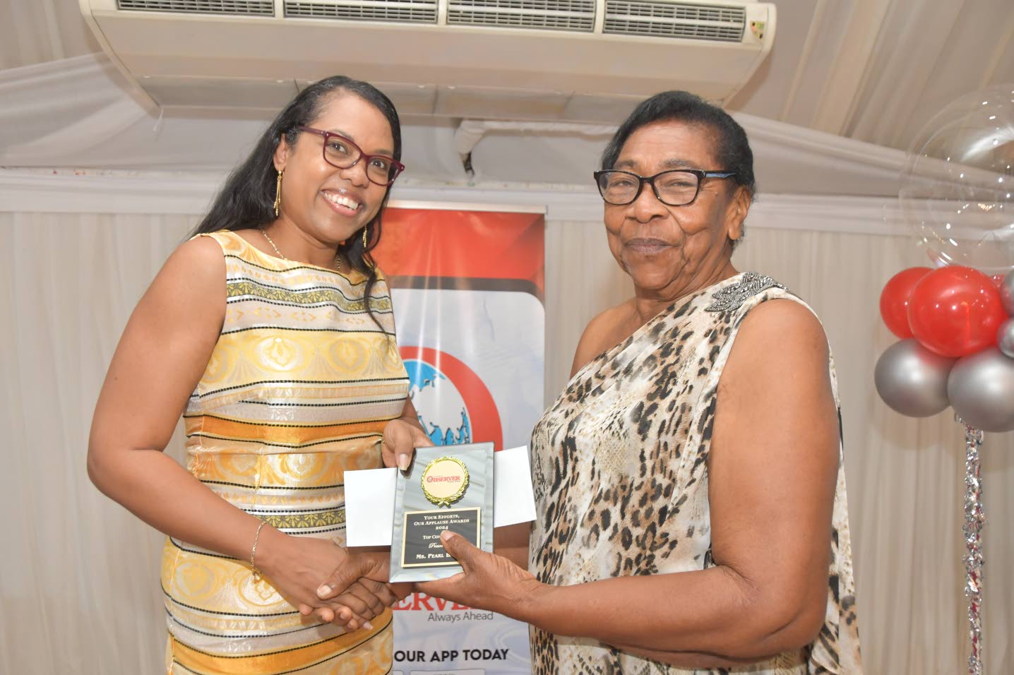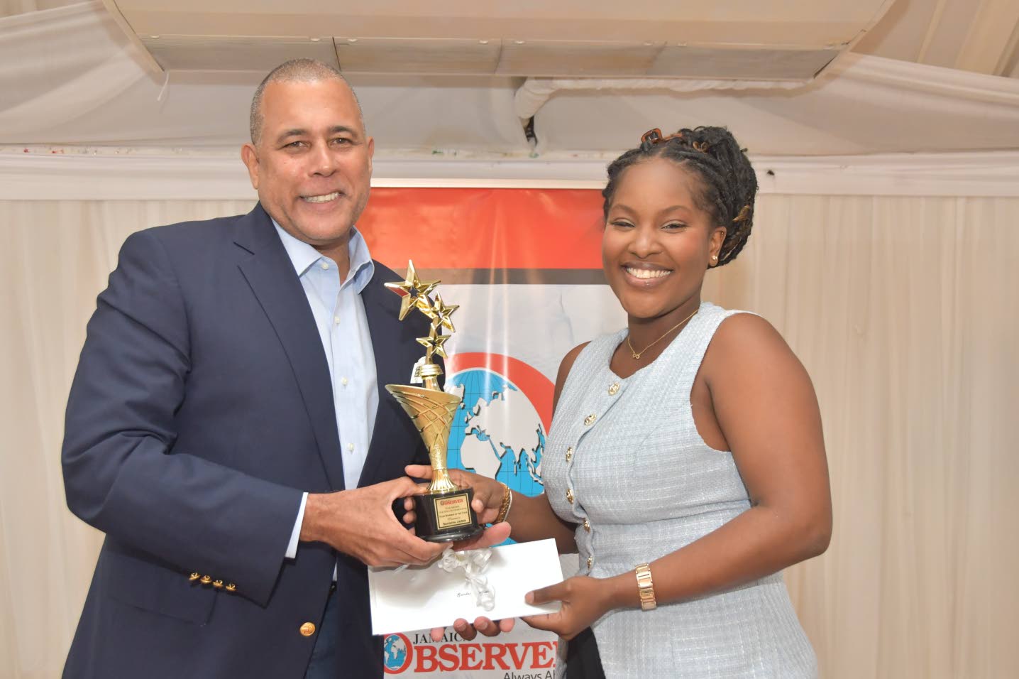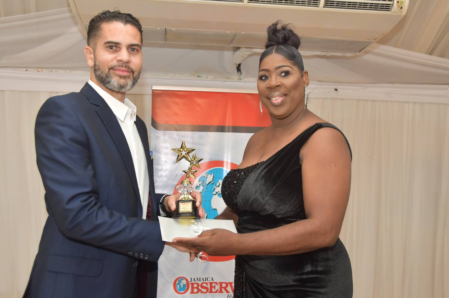 Vendor of the Year Dawnette McLean receives her award from Systems/IT Manager Obadiah Morgan. (Photo: Naphtali Junior)