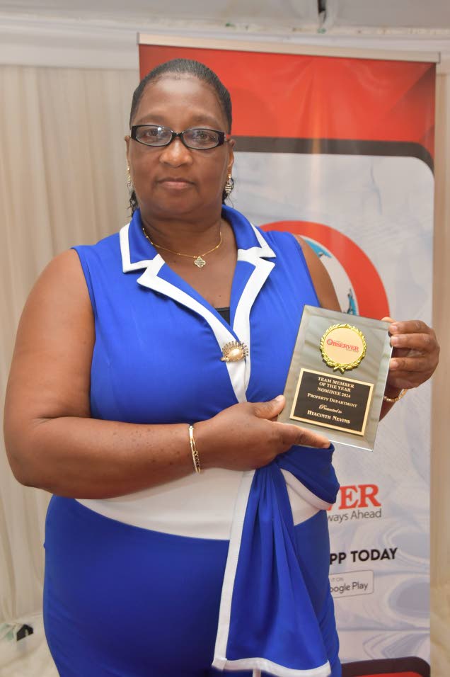 Team member of the Year Sandena James (Digital) receives her trophy from Managing Director Dominic Beaubrun. (Photo: Naphtali Junior)