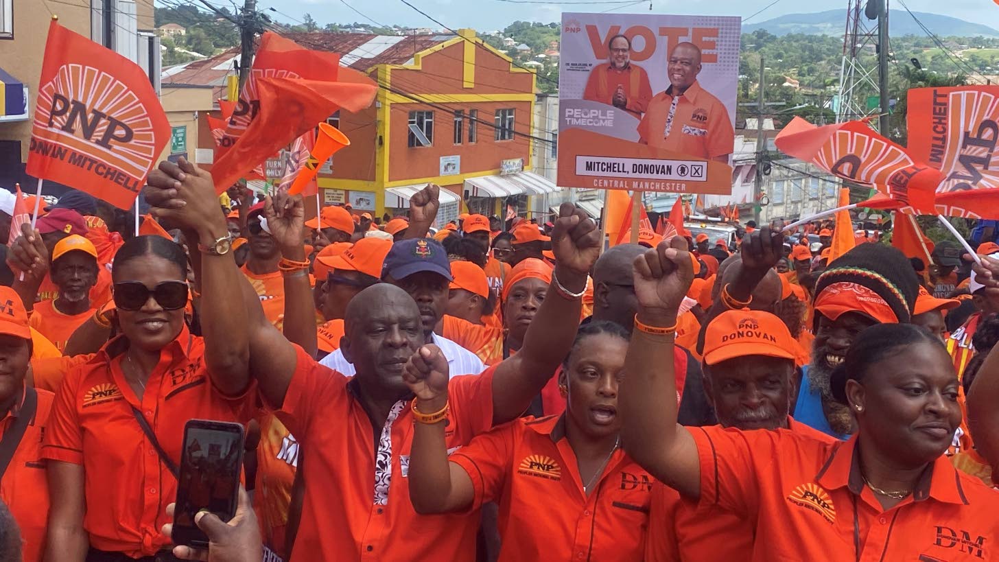 PNP supporters flank the party’s candidate for Manchester Central Donovan Mitchell (third left) on Monday.