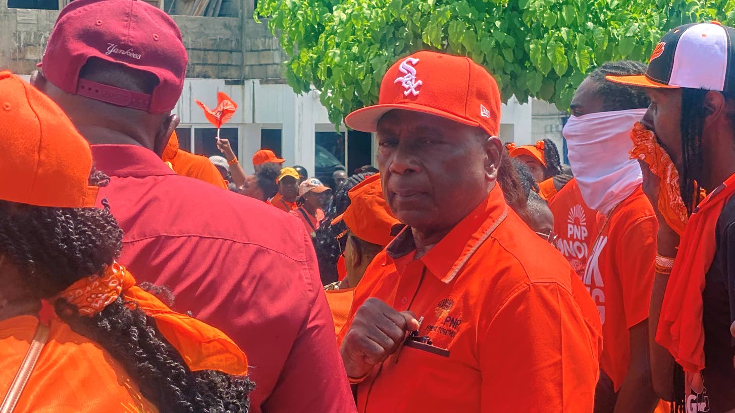 Prominent businessman and influential political activist Kenneth “Skeng Don” Black is pictured among PNP supporters marching with the party’s candidate Donovan Mitchell on Monday.