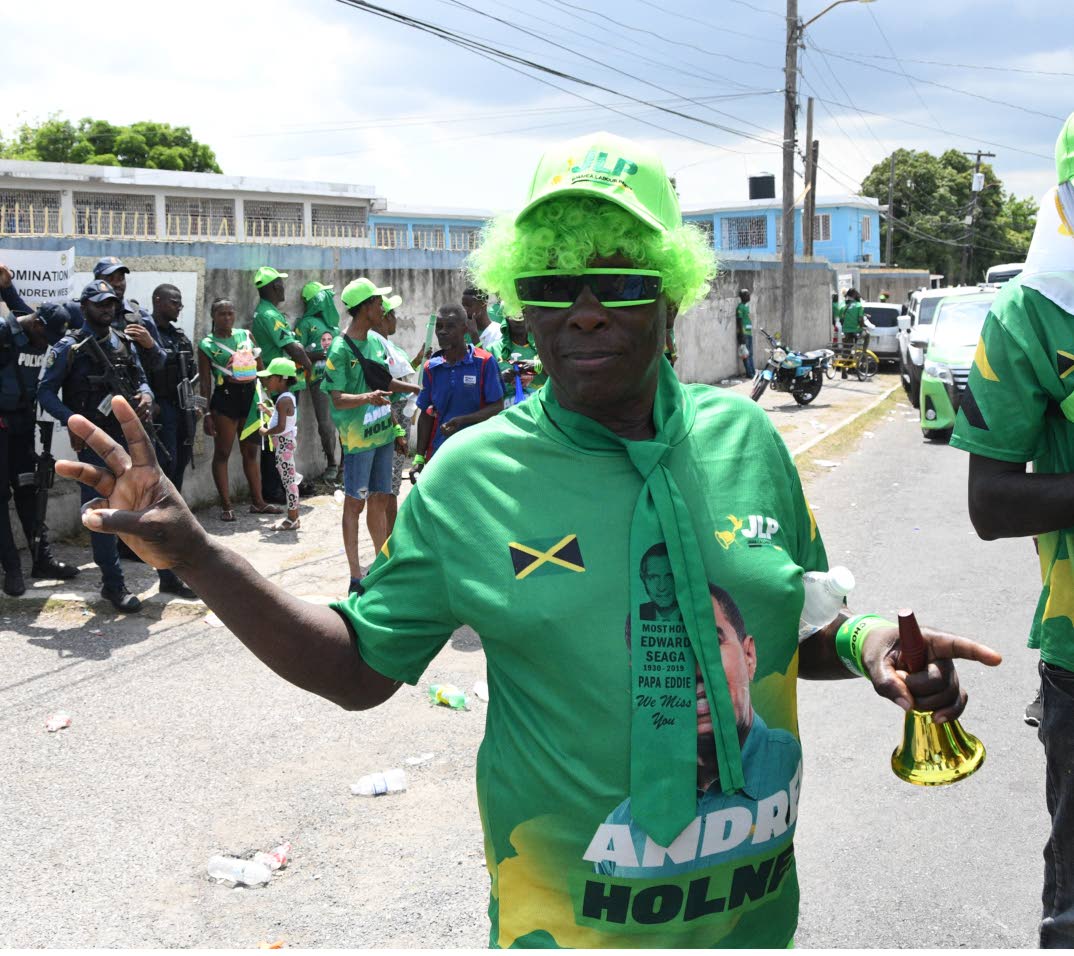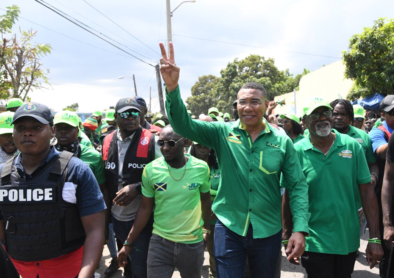 Jamaica Labour Party Leader Prime Minister Dr Andrew Holness, flanked by supporters and members of the security forces, hails supporters with the party’s victory salute as he makes his way from the nomination centre on Waltham Park Road in St Andrew West Central Monday afternoon. (Photo: Joseph Wellington)