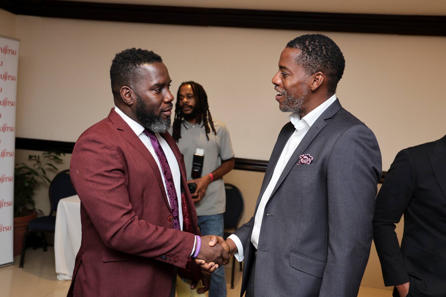 Fujitsu Caribbean’s Vice-President Sales Western Caribbean Jenson Sylvester (right) greets Odean White, Bank of Jamaica’s chief risk officer at the Fujitsu Caribbean’s Cyber Security CEO Breakfast.
