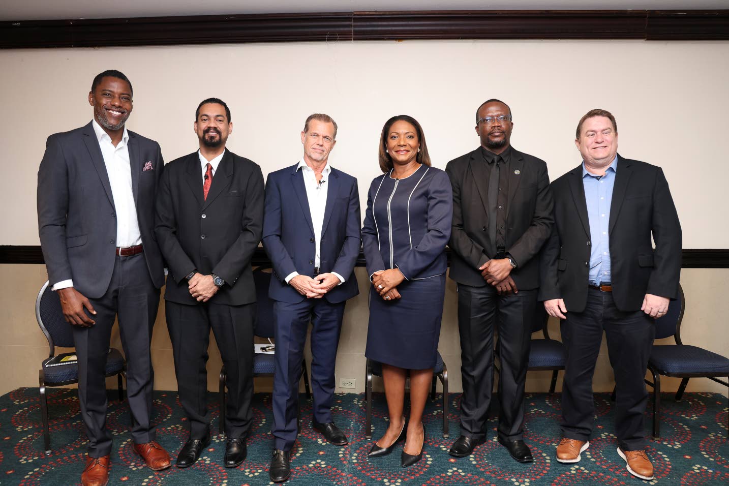 Fujitsu Caribbean’s newly appointed Vice-President, Sales Western Caribbean, Jenson Sylvester (left) joins panellists (from second left) Obika Gellineau, security consultant, Fujitsu Caribbean; Mervyn Eyre, CEO, Fujitsu Caribbean; Barbara Hume, CEO, Jamaica Bankers Association; Lt Col Godphey Sterling, director general, JaCirt; and Phillip Ramson, president, Jamaica Chamber of Commerce at the tech company’s Cyber Security CEO Breakfast at Jamaica Pegasus hotel.