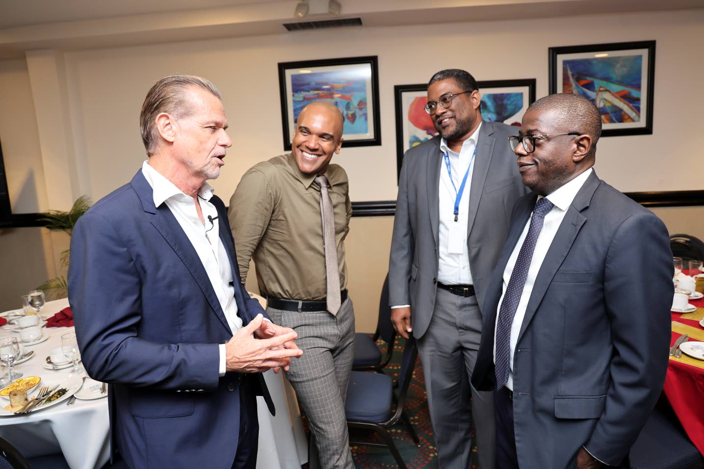 From left: Mervyn Eyre, CEO, Fujitsu Caribbean; Glaister Cunningham, vice-president, EDPM, National Water Commission; Dwayne Pinnock, vice-president portfolio solutions & service delivery at Fujitsu Caribbean; and Everton Anderson, CEO at the National Water Commission are locked in conversation at Fujitsu’s Cyber Security CEO Breakfast at Jamaica Pegasus hotel.