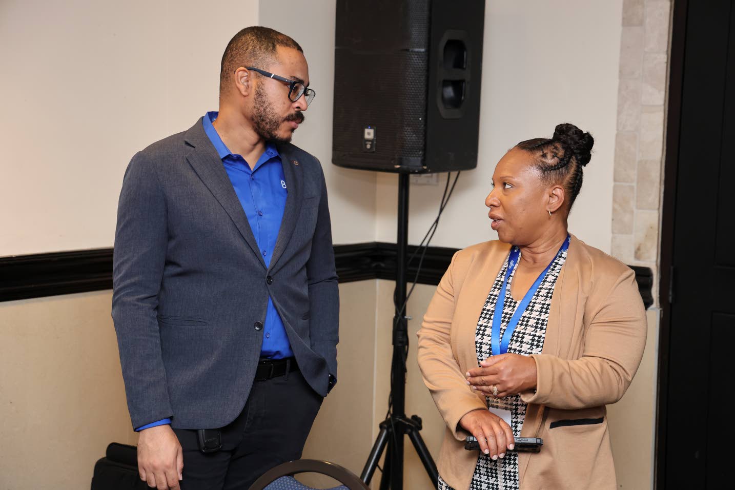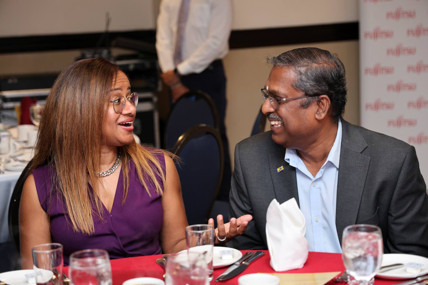 Michelle McNaughton, senior client executive at Fujitsu Caribbean, has a discussion with Mikhail Raymore, head of internal control at Barita Investments during Fujitsu’s Cyber Security CEO Breakfast.