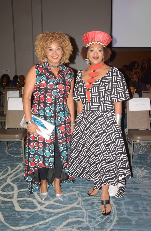 Printastic! Social historian at The University of the West Indies, Mona Professor Verene Shepherd (right) and special needs teacher Karen Lazarus from New York City attracted the Page 2 lens with eye-catching dresses. (Rory Daley)