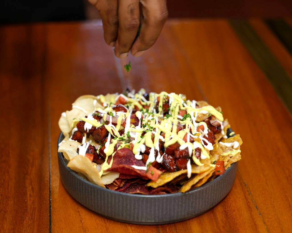 4. To complete the dish — get your platter, place chips as the base, sprinkle on your salsa, then add your Grace Honey Jerk Yaad Style Franks on top, and garnish with fresh chopped parsley. You may also add some shredded cheese or a drizzle of your favourite garlic aioli and avocado crema as shown in the photo.