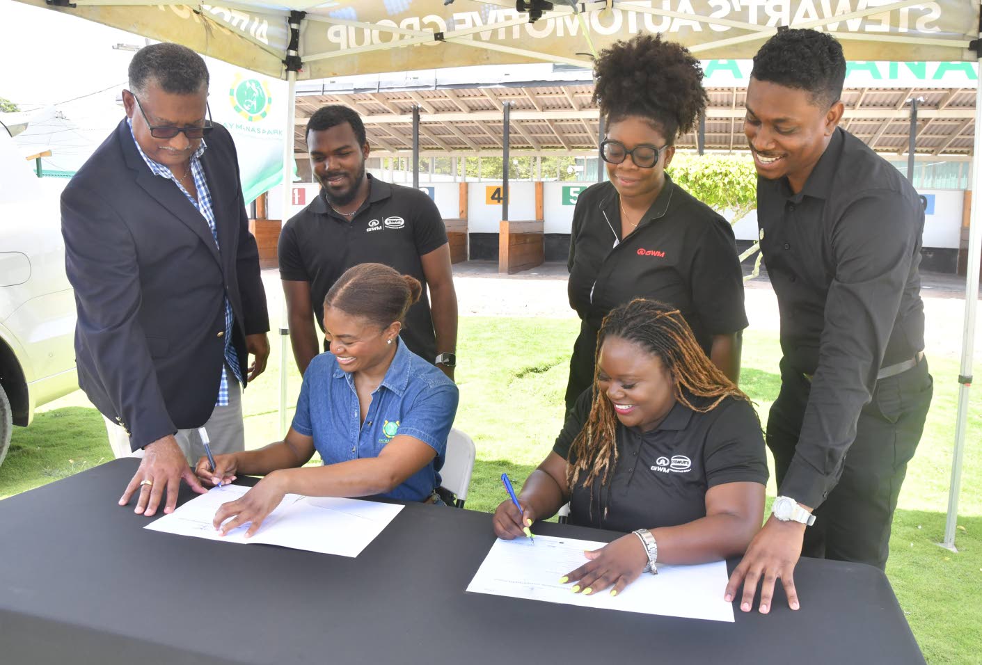 Arielle Beckles (seated left), brand optimisation manager at Supreme Ventures Racing and Entertainment Limited (SVREL), and Titanya Clarke, brand sales manager at GWM, cement a game-changing partnership for the highly anticipated Mouttet Mile during the signing event at Caymanas Park on Thursday, August 22, 2025. Looking on are (from left) Racing Secretary Denzil Miller; SVREL Sales Executive Anuoke Matthews; marketing executive at GVM Latara Boodie-Stevens; and assistant vice-president of market at SVREL Omar Dattadeen. (Photo: Naphtali Junior)