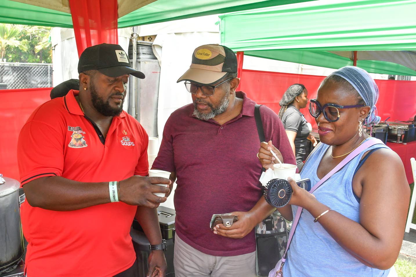 Bulbie Soup Managing Director Nickardo Sayers (left) served a cup of pigtail soup to Forestry Department of Jamaica Director of Finance Conrad Russell as his National Solid Waste Management Authority senior human resource officer wife Delmarie enjoyed hers. (Photo: Karl Mclarty)