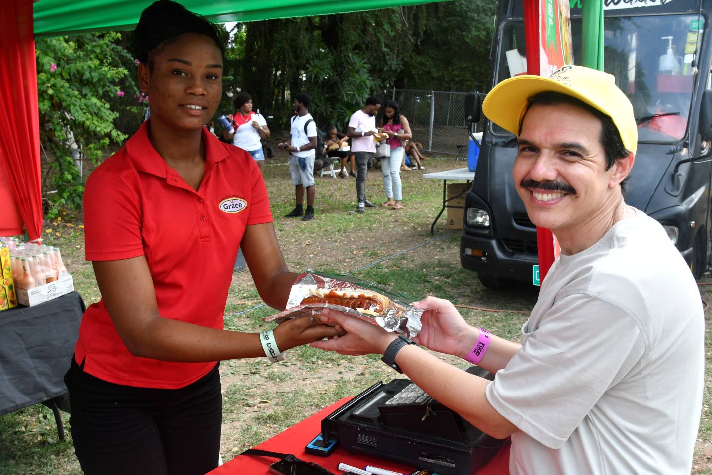 Grace Kennedy Chief Financial Officer Andrew Messado purchased a hot dog from Your Choice’s Shanae Graham. (Photo: Karl Mclarty)