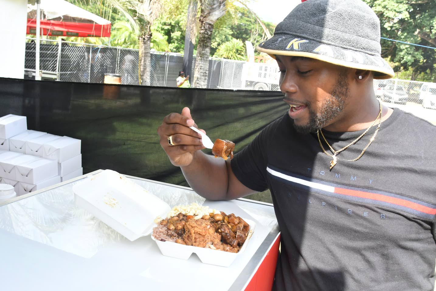 Police officer Andrew Thomas readied to enjoy his fried chicken and stew pork meal from Scotchies. (Photo: Karl Mclarty)