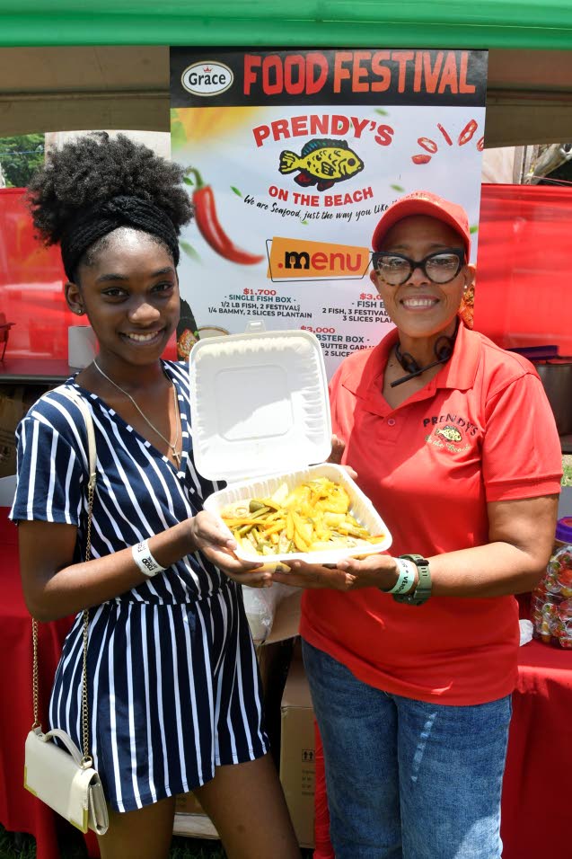Prendy’s on the Beach Managing Director Donnette Prendergast (right) served steam fish to Wolmer’s Girl’s student Tyshawna McCain. (Photo: Karl Mclarty)