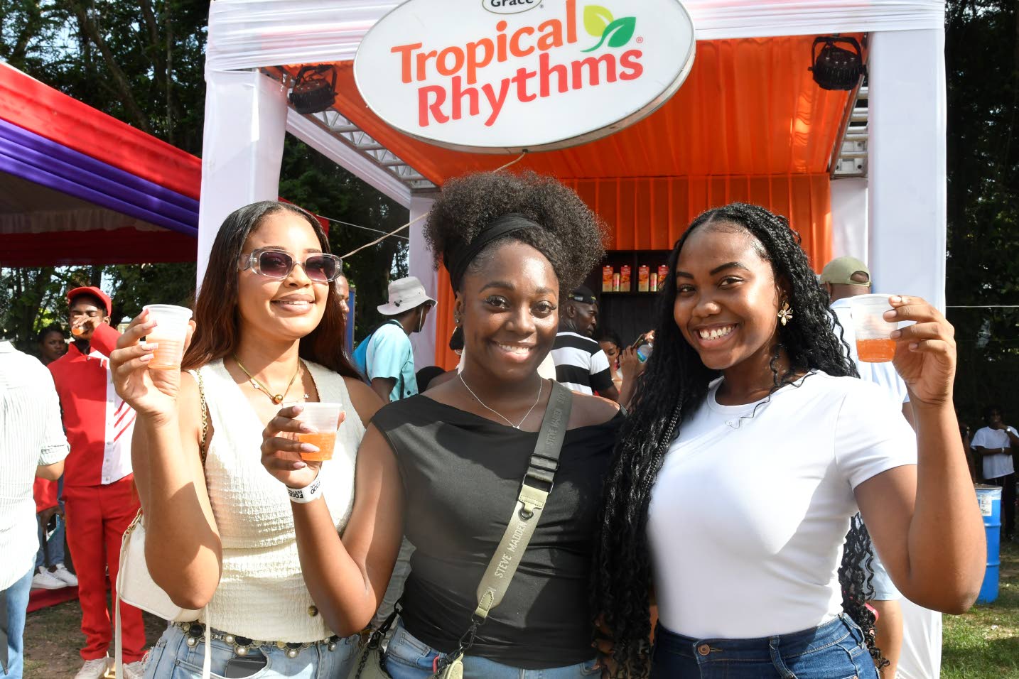 At the Tropical Rhythms booth, eyelash technician Imani Haughton (left), administrative assistant Giselle Campbell (centre), and Dr Ariel McDonald enjoyed sampling the Tropical Rhythms Sparkling Fruit Punch drink. (Photo: Karl Mclarty)