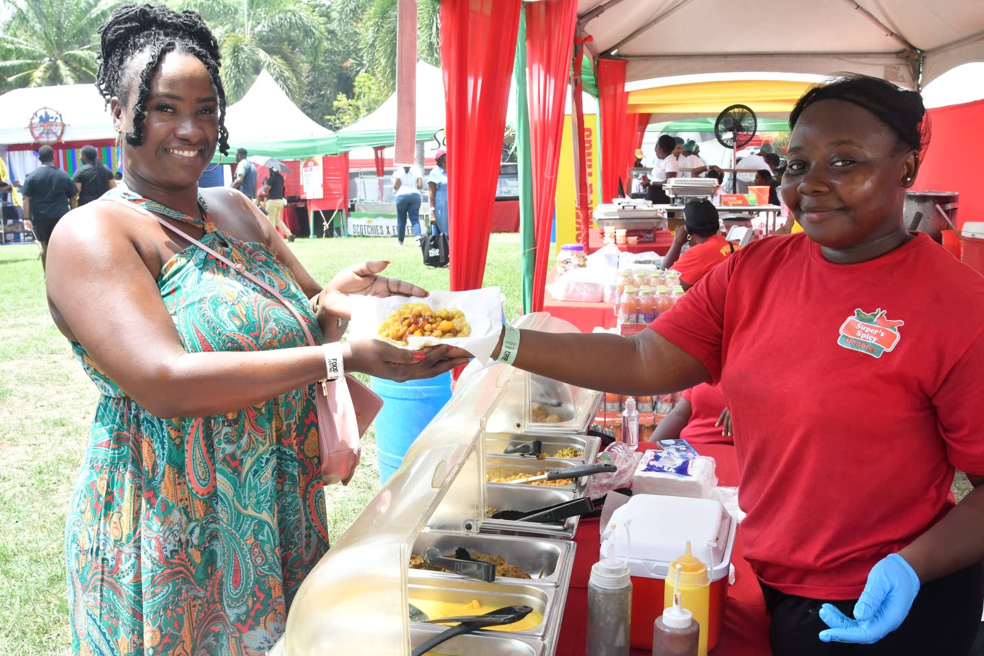 Ministry of Education Pension Administrator Demanya Headley (left) was served shrimp doubles by Super Spicy Doubles’ Josette Miller. (Photo: Karl Mclarty)