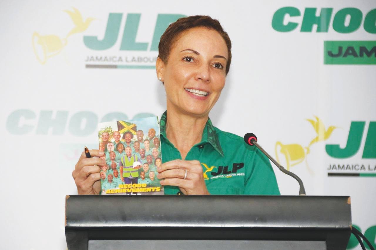 Chair of the Jamaica Labour Party Manifesto and Achievements Committee Senator Kamina Johnson Smith shows a copy of the party’s booklet of achievements at a recent news conference. She said the party will, in the coming days, intensify efforts to ensure that uncommitted voters are further sensitised to the work of the Administration.