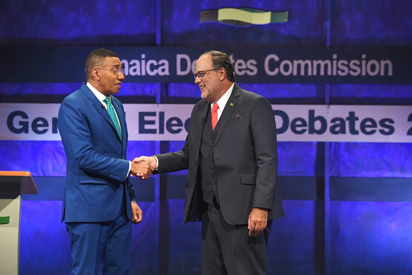 Jamaica Labour Party Leader Prime Minister Dr Andrew Holness (left) shakes hands with People’s National Party President Opposition Leader Mark Golding at the end of the 2025 General Election leadership debate Thursday night at Creative Production and Training Centre studio in St Andrew. (Photo: Collin Reid)