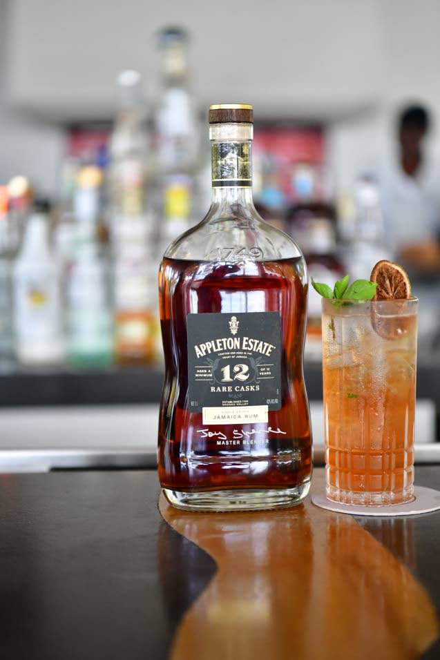 OH: Appleton 12 Fiasco made with: simple syrup, lime juice a splash of ginger ale, two drops of Angostura bitters, garnished with basil leaves and orange rind.
