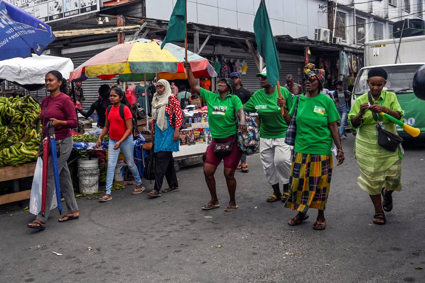 Supporters of the Opposition leader and presidential candidate Aubrey Norton, of the APNU party, rally at the Stabroek Market in Georgetown on August 30, 2025.