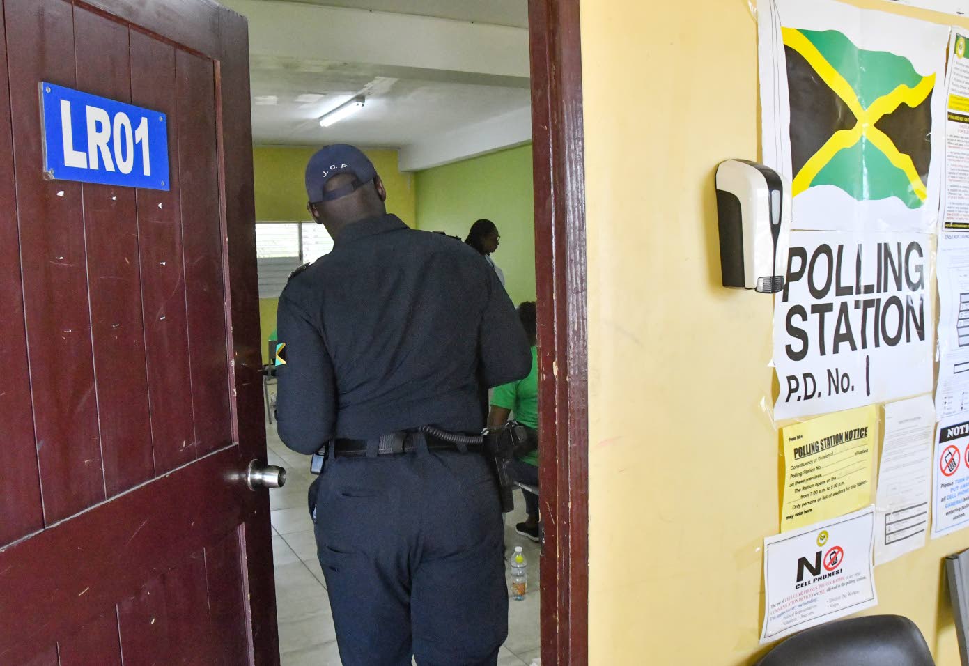 A member of the Jamaica Constabulary Force (JCF) enters a polling station in the Corporate Area on Friday for early voting ahead of the September 3 General Election. The Representation of the People Act makes provisions for election day workers, police, and military personnel to vote ahead of the rest of the population to ensure that they are available for duty on election day. (Photo: Naphtali Junior)