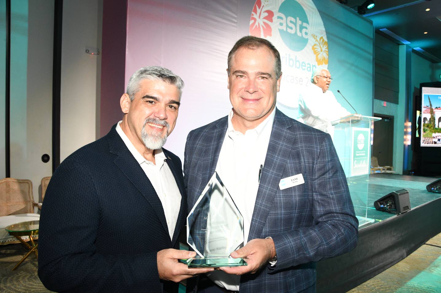 Zane Kerby (right), president and CEO of the 18,000-strong American Society of Travel Advisors (ASTA), receiving his trophy from Unique Vacations’ Chief Operating Officer Andy Blanco on behalf of regional tourism ministers who honoured him with the Award of Excellence for his impact on Caribbean tourism development. Joseph Wellington
