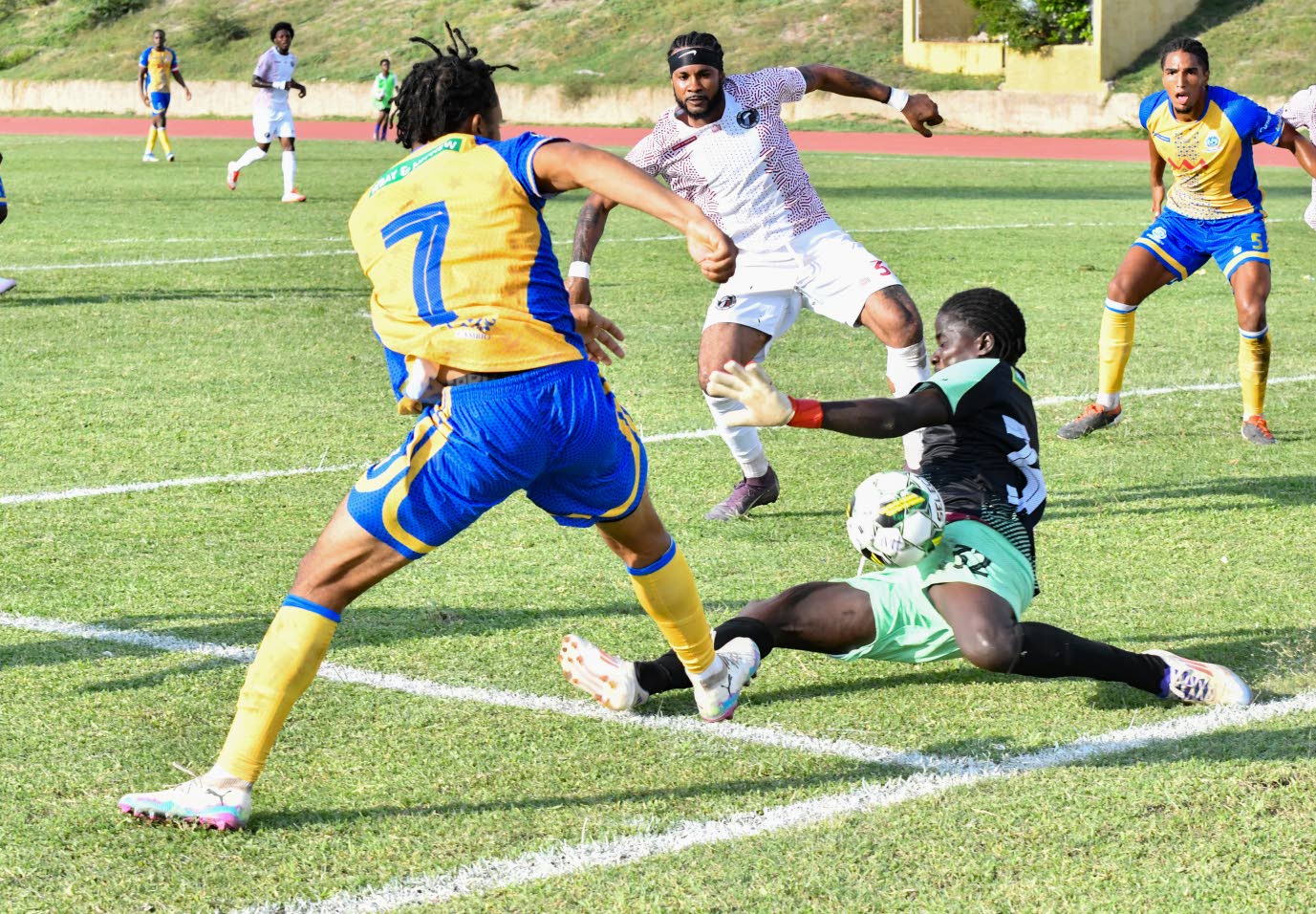 Harbour View forward Oquassa Chong (left) sees his effort saved by Phoenix Chapelton Maroons goalkeeper Prince-Daniel Smith as Phoenix Chapelton Maroons player Kevin Graham (second left) and Anderson Silva look on during the Wray & Nephew Jamaica Premier League encounter at Stadium East on Sunday.