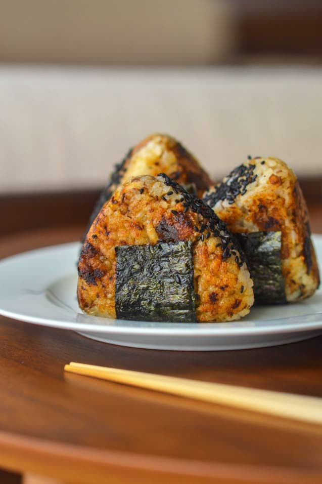 10. Cut a small rectangle of the nori (seaweed sheet), and place at the bottom of the onigiris. Sprinkle the toasted black sesame seeds on top and serve.