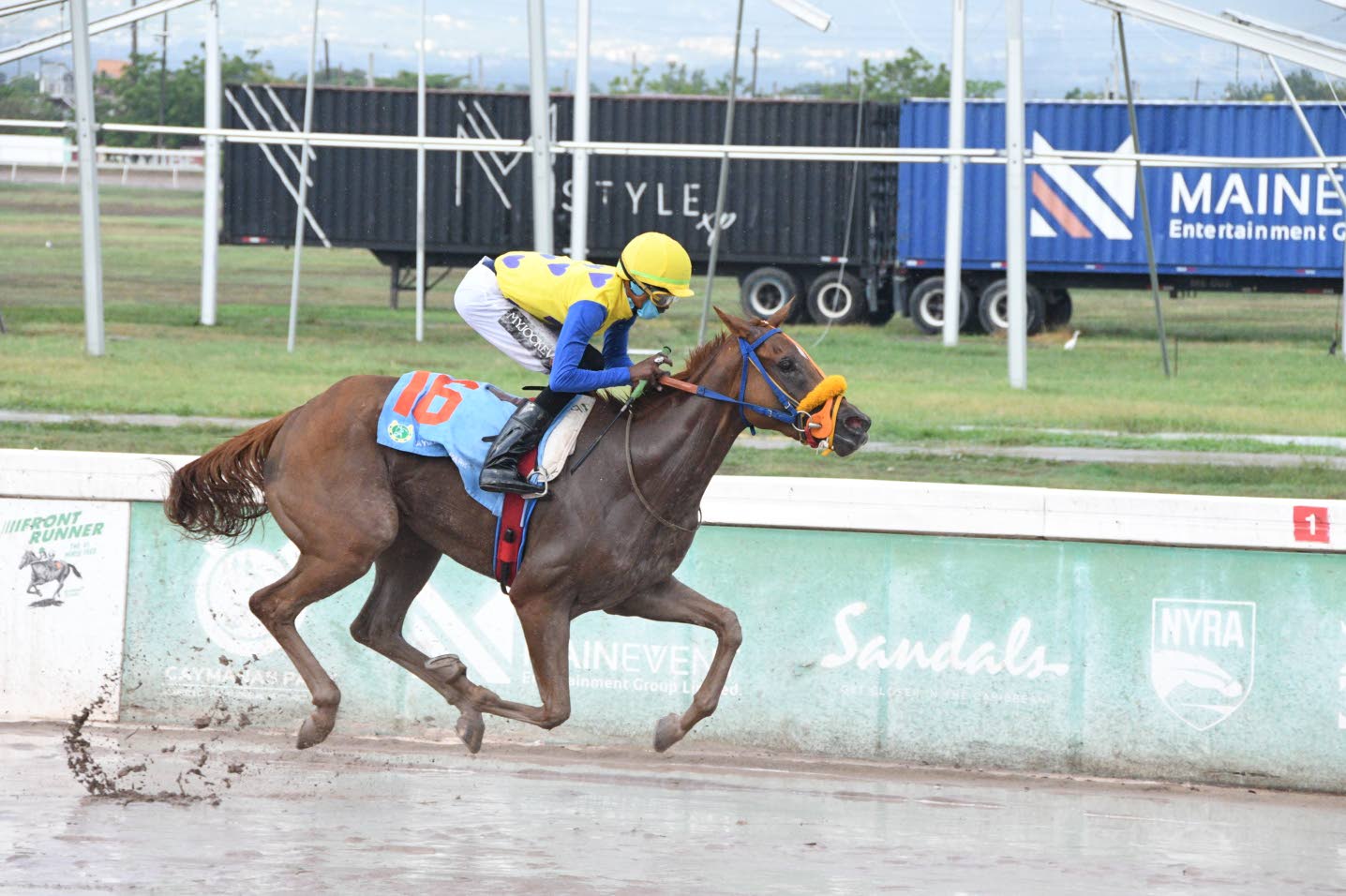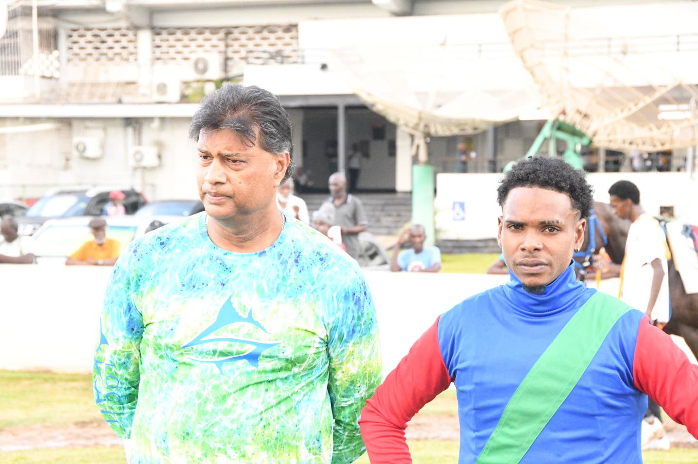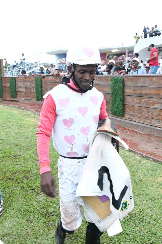 Trainer Gary Griffiths (left) and jockey Youville Pinnock celebrate the win by Wayne’s Princess. (Joseph Wellington)