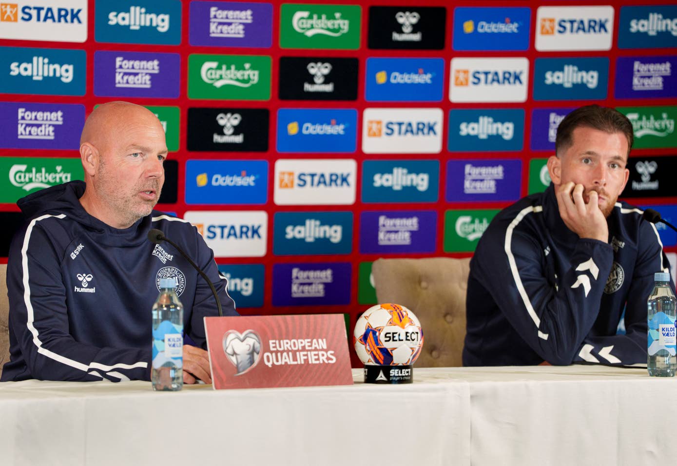 Denmark’s national football team coach Brian Riemer (left) and Denmark’s midfielder Pierre Emile-Hojbjerg address a press conference after a training session in Helsingoer on September 4, 2025. Denmark prepares to play Scotland in a FIFA World Cup 2026 qualifying match on September 5, 2025. (Photo: AFP)