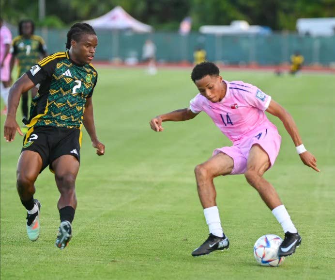 Jamaica goalscorer Damion Lowe (left) tracks Bermuda’s Reggie Lambe during their Concacaf World Cup Qualifying match at the National Stadium in Devonshire, Bermuda, on Friday. Concacaf Media
