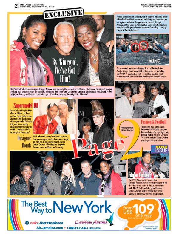 Jamaica Observer Senior Associate Editor — Lifestyle & Social Content Novia McDonald-Whyte sure did snag the exclusive with Italian designer Giorgio Armani moments after his Milan Giorgio Armani blue show in 2010. Also photographed was fashion designer Keneea Linton-George. The image appeared on Page 2 Thursday, September 30, 2010.